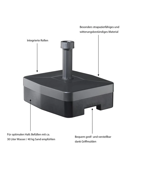 Ein Leichtgewicht, das sich ganz schön schwer machen kann Mal federleicht, mal extrem schwer – dieser Kunststoffschirmständer mit Rollen ist unglaublich wandelbar und beweglich! Wird die Frühlingssonne im Mai langsam so warm, dass Sie gerne über Mittag ein Schattenplätzchen hätten, holen Sie Ihren Kunststoffschirmständer mit Rollen ohne Mühe aus dem Keller hoch und stellen ihn auf die Terrasse oder den Balkon. Denn leer ist der Kunststoffschirmständer mit Rollen unglaublich leicht. Mit Sand oder Wasser gefüllt, ist der Kunststoffschirmständer mit Rollen dann so schwer und standfest, dass er Ihren Sonnenschirm sicher halten kann.