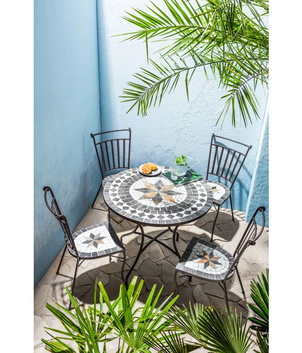 Sie besitzen einen Holz-, Keramik- oder einen kleinen Bistrotisch? Dann werden Sie hocherfreut sein, wie gut eine Bestuhlung mit dem Dehner Mosaikstuhl Diana sich dazu macht. Denn mit ihm verwandeln Sie die unterschiedlichsten Tische in dekorative Tischgruppen mit südländischem Flair. Und weil er so schön robust ist, lässt er sich auch ideal auf grob gepflasterten Terrassen oder befestigten Schotterflächen einsetzen. Das heißt, er macht Sie auch noch flexibel. Denn er kann mühelos heute auf der Terrasse und morgen auf der Freisitzfläche im Garten aufgestellt werden! Also einfach dort, wo Sie es gerade brauchen.