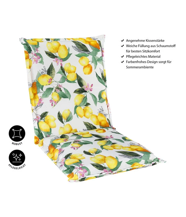 Die Vorzüge des Produkts in Markenqualität aus dem Hause Dehner sieht man auf den ersten Blick: Das Dekor des Polsters entführt Sie in einen mediterranen Zitrushain. Seine Schaumfüllung und die behagliche Kissenstärke sorgen für einen perfekten Sitzkomfort. Aber das ist nicht alles: Neben seiner attraktiven Optik verfügt das Niederlehnerpolster auch über einen besonders pflegeleichten Bezug aus 100 % Polyester. Damit ist er für die nächste Gartenparty sowohl mit der Familie als auch mit Freunden bestens geeignet. Worauf sollten Sie noch warten: Greifen Sie zu und holen Sie sich das Dehner Niederlehnerpolster ‚Menton‘ zu sich nach Hause!
