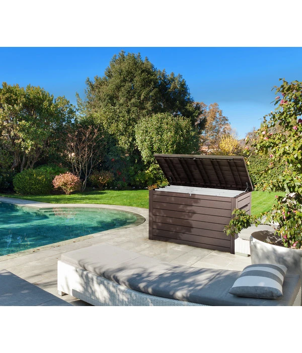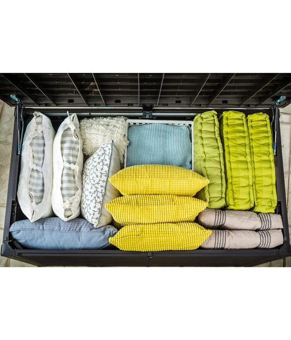 Wenn die ganze Familie im Garten aktiv ist, dann kommen unterschiedliche Spielsachen, Geräte, Utensilien und vieles mehr zum Einsatz. Dank der Keter Auflagenbox Ontario haben Sie immer einen optimalen Ort zur Verfügung, an dem sich alles ganz leicht verstauen lässt. Tragen Sie somit zur Sicherheit, Ordnung und Übersicht in Ihrem Außenbereich bei und profitieren Sie zugleich davon, alle wichtigen Dinge griffbereit zu haben. Natürlich profitieren Sie ebenso von einem modernen, dunklen Design und sorgen so für einen zeitgemäßen und geschmackvollen Akzent an vielen Orten.