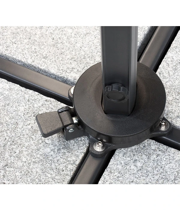 Zur praktischen Handhabung des Öffnens und Schließens dient eine Kurbel, die sowohl das Aufspannen des Ampelschirms wie auch die Aufrichtung und Neigung entlang des Mastes übernimmt. Mit einem Hebel fixieren Sie den Schirm am Stock in der richtigen Höhe. Die Drehung um die eigene Achse regulieren Sie ganz einfach mit einem Fußpedal am Ständer. Für das Verstauen und Abdecken liefert der Hersteller eine lichtundurchlässige Schutzhülle mit Reißverschluss und Stab zum bequemen Überziehen mit.