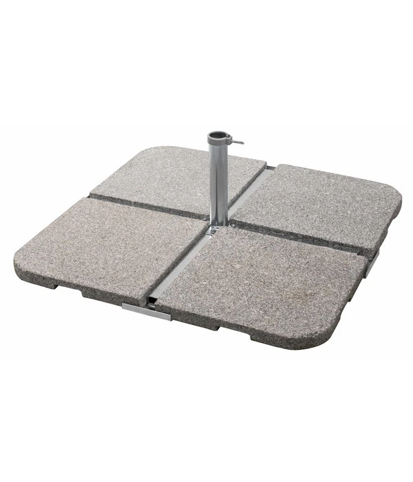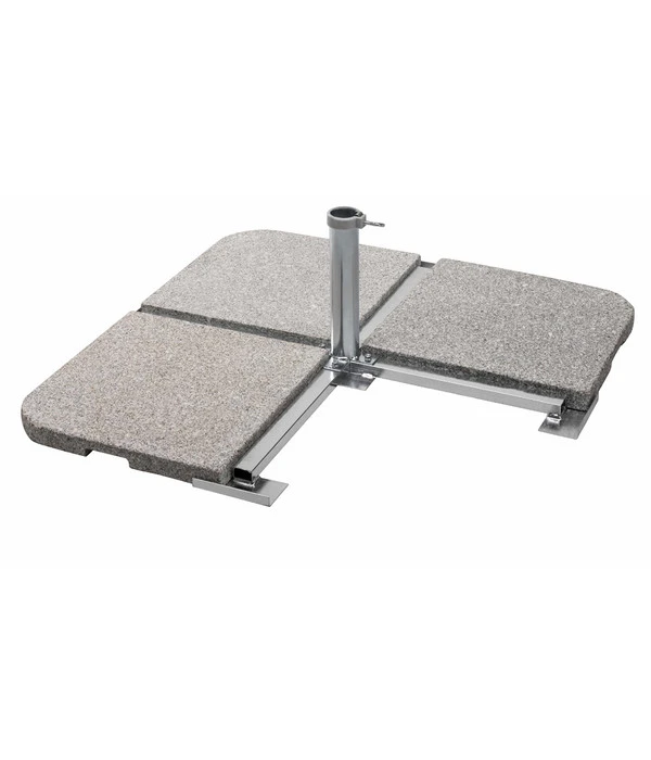 Der Schneider Plattenständer ist ideal zur Aufstellung in sehr windigen Arealen. Mit seinen vier Auflagen ermöglicht er den Einsatz von Wegeplatten mit den Maßen 50 x 50 x 5 cm. So entsteht ein extra schwerer Schirmständer, der auch starken Böen standhalten kann. Dank der Verarbeitung von feuerverzinktem Stahl und eloxiertem Aluminium ist der Schneider Plattenständer äußerst robust und wetterfest. Er kann das ganze Jahr im Freien stehen, ohne Verrottungsspuren zu zeigen. Die Haltevorrichtung bietet Raum für Schirme mit einem Rohr von bis zu 55 mm Durchmesser. So steht Ihr Sonnenschutz sicher und stabil, um Ihnen zuverlässige Dienste zu leisten.