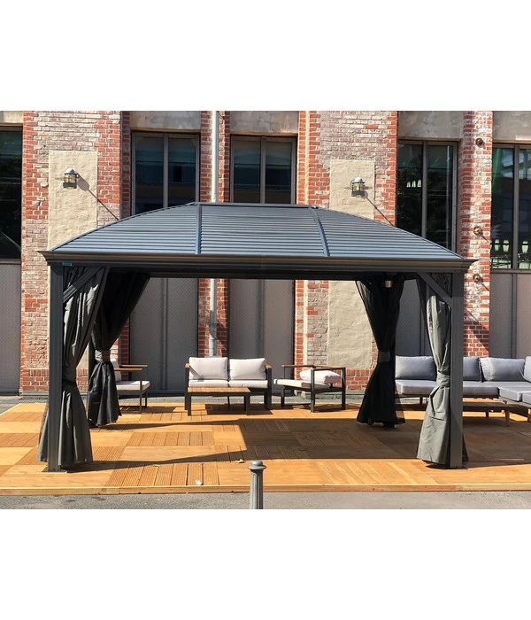 Anders als viele andere Gartenpavillons zeichnet den Sojag Pavillon Moreno seine luftig-leicht wirkende, aber sehr massive Konstruktion aus. Das Besondere ist das Dach, das nicht aus Kunststoffplatten oder Stoff besteht, sondern aus langlebigem und beständig formschönem Stahl gefertigt wurde. Das Dach ruht auf rostresistenten, pulverbeschichteten Aluminium-Pfosten, mit einer Pfostenstärke von 12 cm. Da auch die Schrauben aus rostfreiem Edelstahl sind, müssen Sie den Sojag Pavillon Moreno für den Winter nicht abbauen, sondern können ihn jahrelang draußen unter freiem Himmel stehen lassen. Selbst in schneereichen Wintern müssen Sie keine Sorge haben, denn das Dach kann eine Schneelast von 150 kg/m² tragen. Und die integrierten Regenrinnen sorgen für einen geregelten Abfluss von Regenwasser.