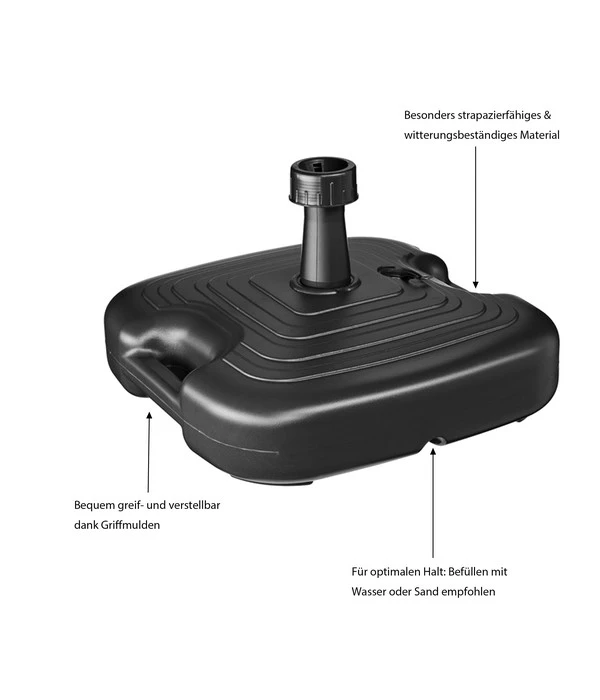 Der Schirmständer besteht zu 100 Prozent aus Polyethylen. Das Material ist aufgrund seiner geringen Dichte besonders leicht und somit einfach zu transportieren. Trotz der Leichtigkeit ist der Sonnenschirm-Ständer, Kunststoff, 45 x 45 cm, äußerst robust. Durch die Temperaturbeständigkeit ist Polyethylen ideal für heiße Sommertage geeignet. Dieser Ständer sorgt bestimmt lange Zeit für Schatten.