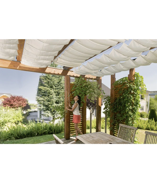 Das Sonnensegel überzeugt durch Effizienz, denn es lässt sich seitlich verschieben und bietet Ihnen dadurch genau dort Schatten, wo Sie Ihn gerade benötigen. Ärgern Sie sich nie wieder mit dem mühsamen Platzieren von Sonnenschirmen, welche nicht für ausreichend Schutz sorgen und schlussendlich sich Ihr Gesicht noch immer im Sonnenlicht befindet. Dank der Strapazierfähigkeit des hochwertigen Gewebes werden Sie lange Zeit Freude an Ihrem Produkt haben. Durch die Witterungsbeständigkeit eignet sich das Segel optimal für die Außenbeschattung. Das Sonnensegel ist einfach waschbar, da das Polyester-Material durch Pflegeleichtigkeit besticht. Nach dem Waschen knittert das Material nicht und trocknet schnell. Der wunderbare Nebeneffekt des eleganten Sonnensegels besteht darin, dass es Ihren Garten optisch aufwertet. Ihr grünes Wohnzimmer wird zu einem echten Hingucker. Das Segel ist in verschiedenen Farbvariationen erhältlich. Sie werden daher bestimmt ein Farbdesign finden, das perfekt mit Ihrer Umgebung harmoniert. Der helle und leichte Stoff lässt Ihre Entspannungsoase trotz Beschattung hell und freundlich wirken. Erholen Sie sich an heißen Tagen in einer angenehmen, kühlen Atmosphäre unter Ihrem Sonnensegel.